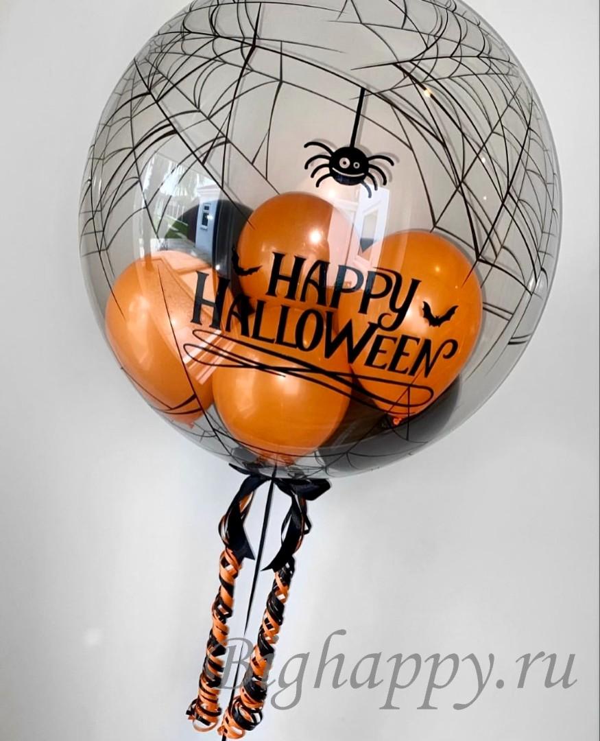 Наполнение — латексные шарики оранжевого и чёрного цветов, а на поверхности — эффектный принт с паутиной, пауком и надписью Happy Halloween.