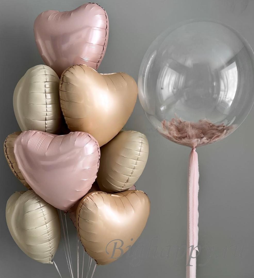 Большой баблс с лёгкими перьями внутри создаёт атмосферу трепетной романтики, мягко паря в воздухе. Композицию дополняет изящный фонтан из фольгированных сердец в тёплых природных оттенках — розовом, кремовом и молочном. Такой набор становится выразительным акцентом праздника, подчёркивая значимость момента и даря ощущение тёплой, светлой гармонии.