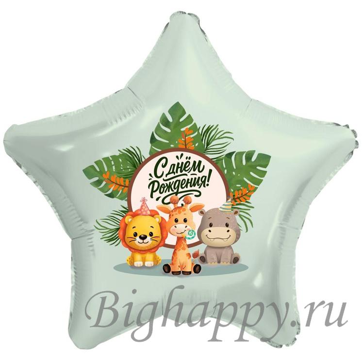 Звезды светло-мятного цвета с металлизированным покрытием. На лицевой стороне размещён детский тематический принт: изображение трёх мультяшных персонажей — львёнка, жирафа и бегемота в праздничных колпачках. За персонажами расположены декоративные тропические листья. В верхней части композиции находится круглая рамка с надписью «С днём рождения!», выполненной зелёным шрифтом.