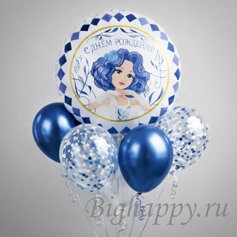 Букет дополнен латексными шарами, включая прозрачные шары с конфетти и без, и синие шары-хром.