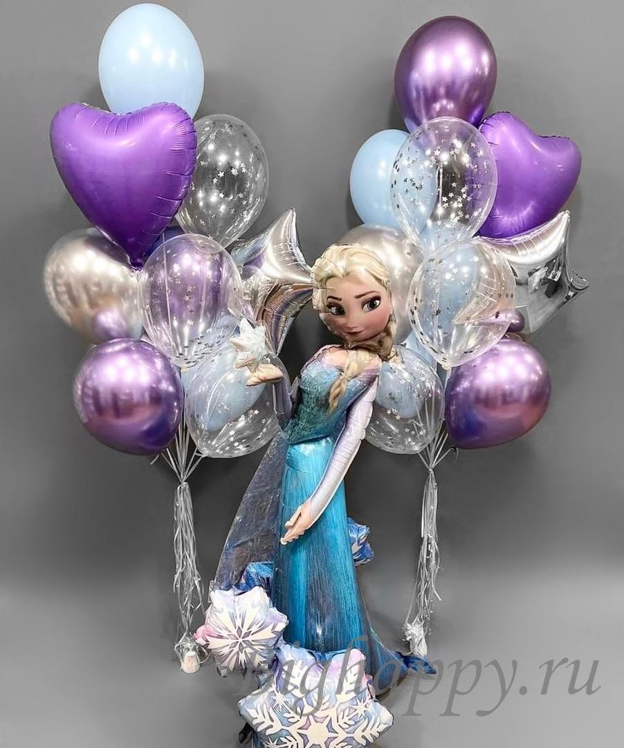 Волшебная композиция с фольгированной фигурой Эльзы из мультфильма Холодное сердце! В её голубом платье, окружённая нежными фиолетовыми, серебристыми и прозрачными шарами, она создаёт атмосферу настоящего зимнего чуда. Идеальное оформление для детского праздника, фотозоны или сюрприза, который подарит радость и сияние в глазах маленьких поклонников королевства Эренделл!