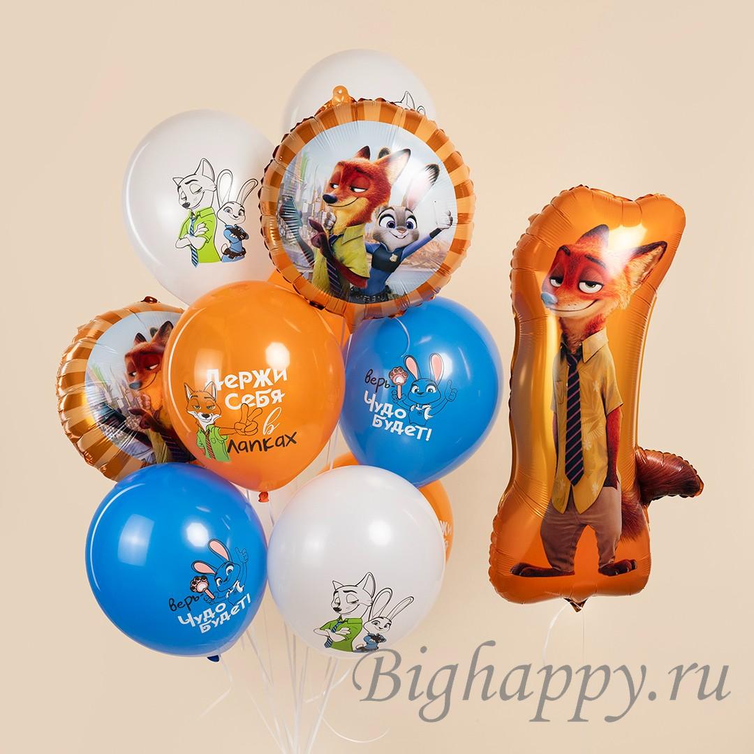 В композиции собранылатексные и фольгированные шары в синих, оранжевых и белых оттенках, создающих яркую и динамичную цветовую гамму. Латексные шары украшены принтами с персонажами мультфильма — Джуди Хоппс и Ником Уайлдом, а также позитивными надписями «Верь — чудо будет!» и «Держи себя в лапках».