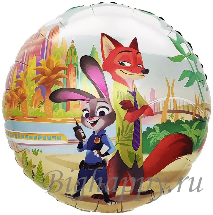 Выполнен в классической круглой форме и украшен красочным изображением главных персонажей — Джуди Хоппс и Ника Уайлда. Герои изображены на фоне красочного города Зверополиса. Джуди предстает в полицейской форме с рацией в лапке и своей фирменной энергичной улыбкой, а Ник стоит рядом с хитрой ухмылкой и скрещёнными лапами, демонстрируя свой спокойный и уверенный характер.