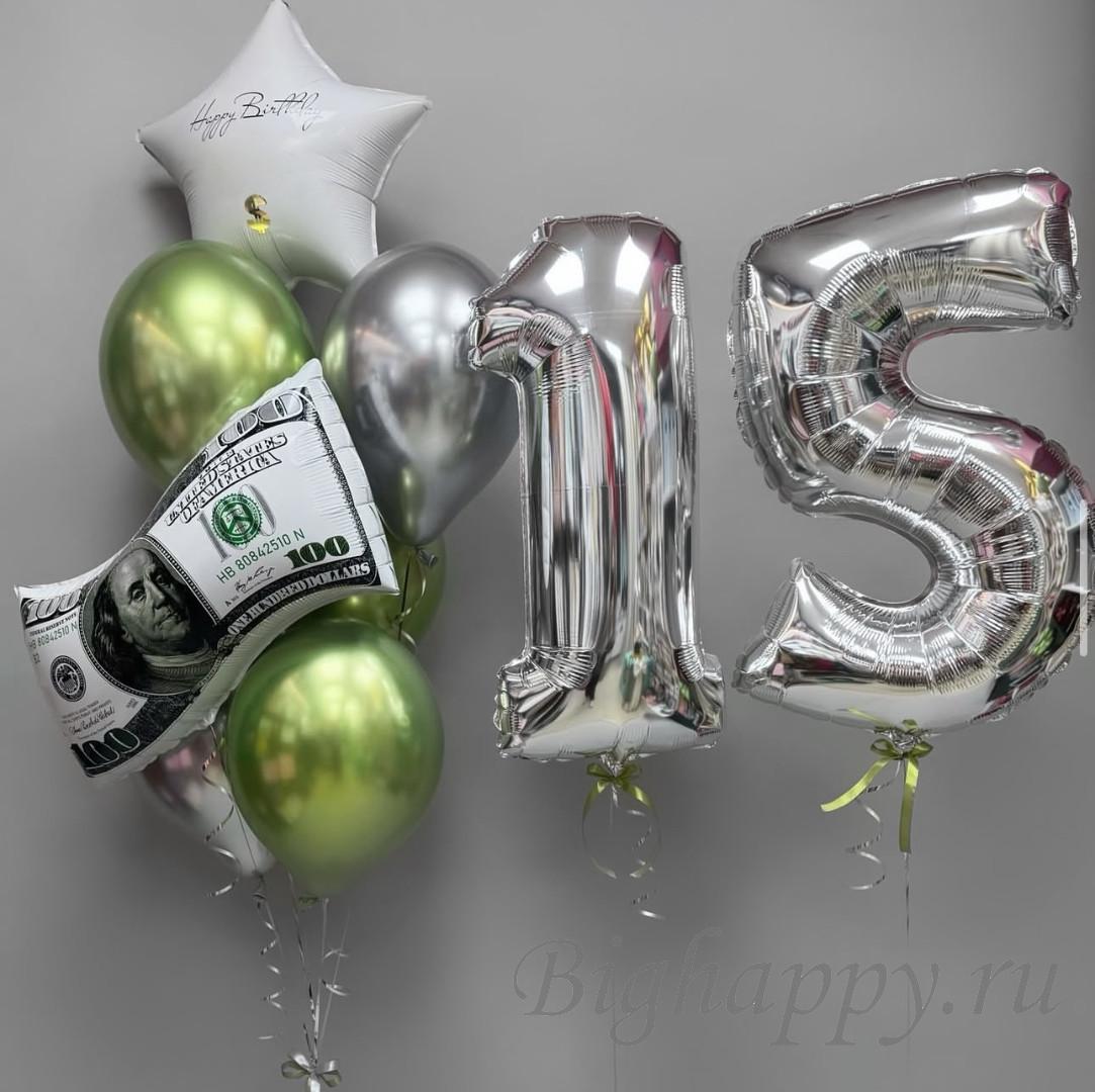 Яркий и эффектный набор для празднования 15-летия! Серебристые цифры, сияющие шары-хром и купюра с Бенджамином Франклином создают атмосферу стиля и достатка. Зелёные и серебристые оттенки придают композиции свежесть и энергичность. Идеальный выбор для подростка, который мечтает о победах и блестящем будущем!