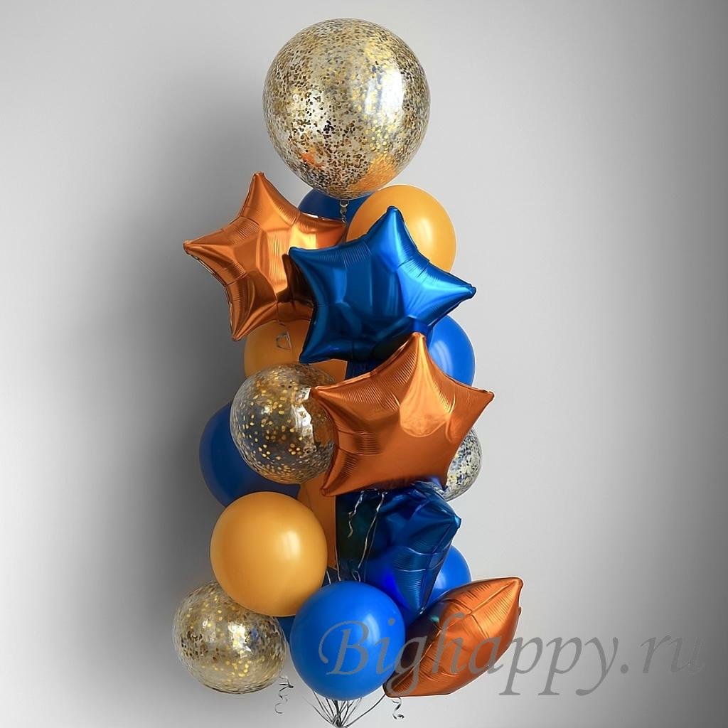 Высокий букет с круглым прозрачным шаром диаметром 90 см с конфетти и Вашей надписью. Текст нанесён с одной стороны. Помимо большого шара в связку входят шарики: