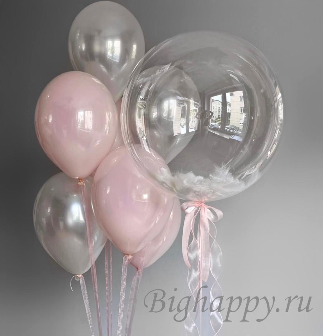 Воздушная композиция в бело-розовых тонах создаёт атмосферу лёгкости и романтики. Большой прозрачный бабл с белыми перьями внутри придаёт утончённости, а сочетание мягких оттенков добавляет нежности и уюта. Идеально подойдёт для дня рождения, выписки, фотосессии или оформления романтического события.