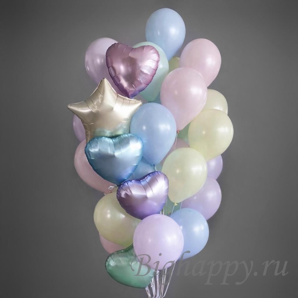 Композиция состоит из 25 гелиевых шариков пастельных тонов (5 мятных, 5 нежно-розовых, 5 сиреневых, 5 цвета айвори и 5 небесного оттенка) и 4 фольгированных сердец (голубое, розовое, мятное, сиреневое), а дополняет всё это великолепие золотистая звёздочка.