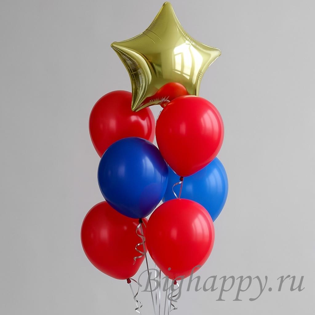 Недорогой напольный фонтан из воздушных шаров в стиле супергероев состоит из латексных шаров синего и красного цвета и золотой звезды.