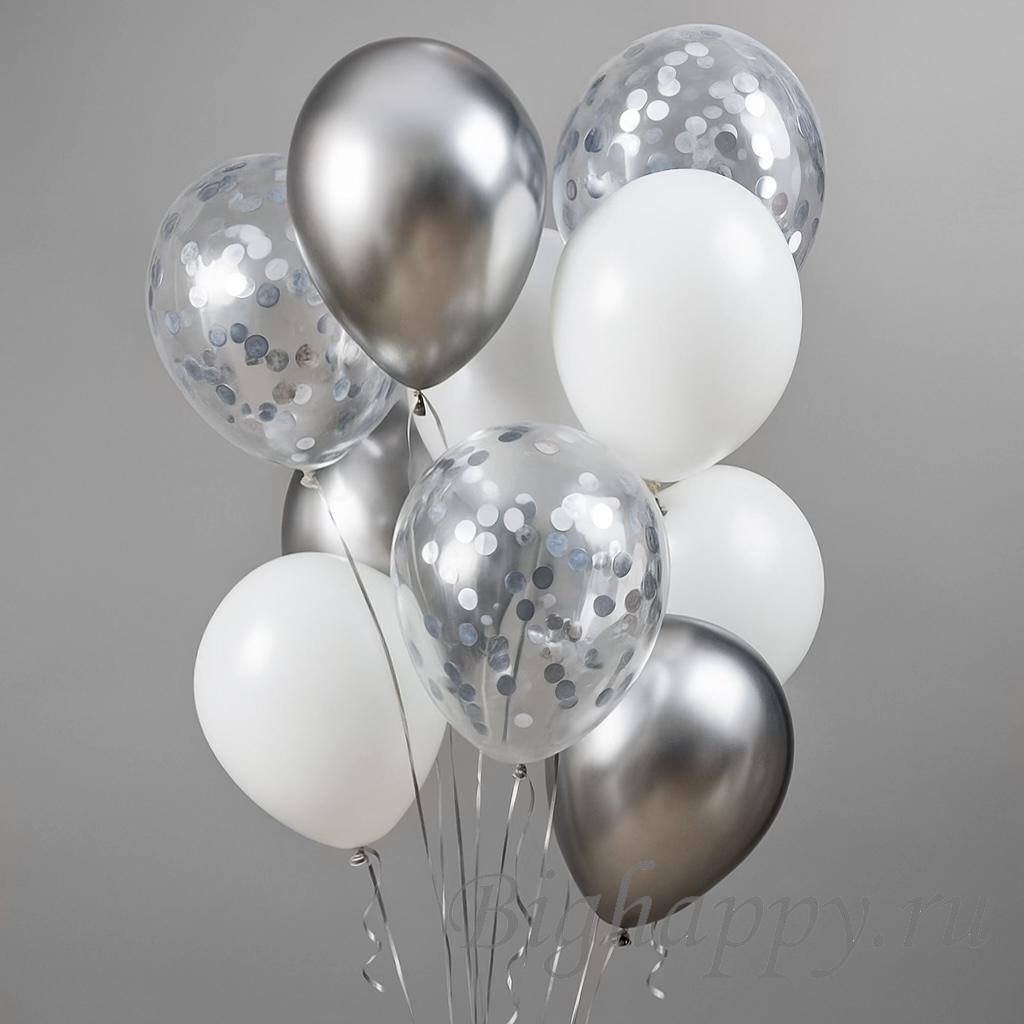 В состав композиции входит – три латексных шара хром, три латексных шара с конфетти и три белых латексных шара.