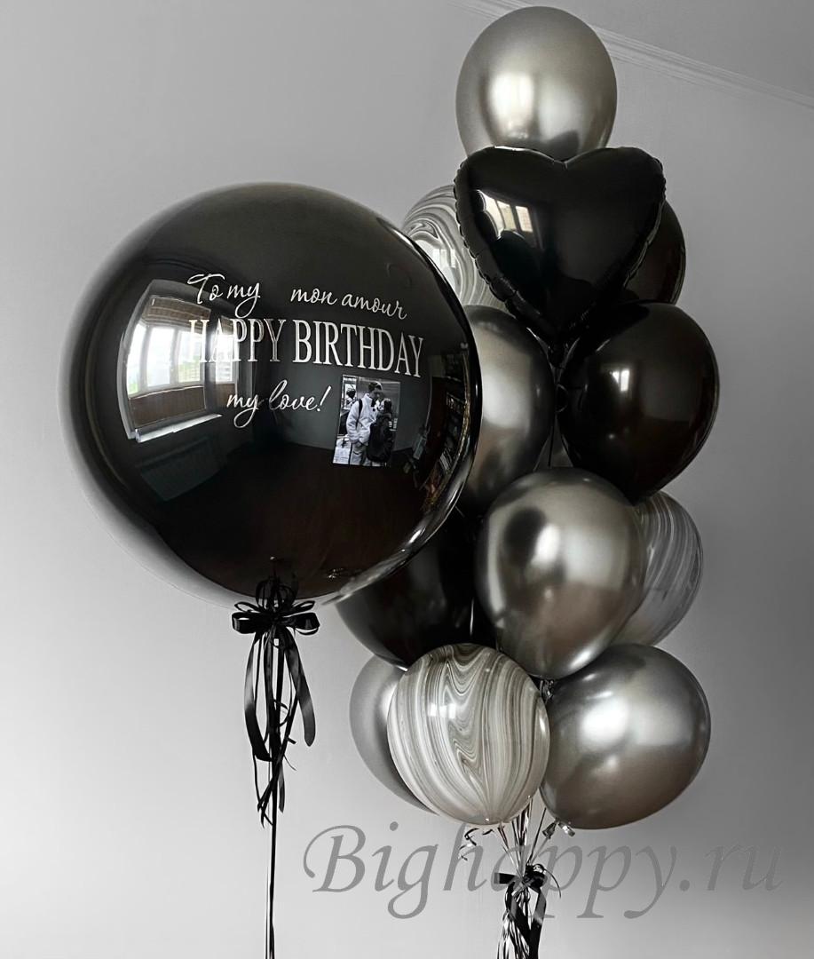 Эффектная композиция в современном чёрно-серебристом стиле подчеркнёт особенность момента и добавит торжеству индивидуальности. Большой дабл стафф с персональной надписью и фото в сочетании с фонтаном из хромированных, агатовых и фольгированных элементов создаёт выразительный акцент. Такой набор станет идеальным решением для мужского праздника, фотозоны или стильного подарка.