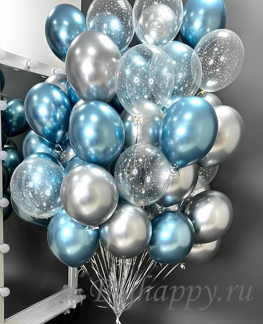 Волшебная композиция из воздушных шаров в серебристых, небесно-голубых и прозрачных тонах создаёт атмосферу праздника и лёгкости. Элегантное сочетание оттенков с мерцающими деталями идеально подойдёт для дня рождения, юбилея или романтического вечера, превращая любое событие в яркий и запоминающийся момент.