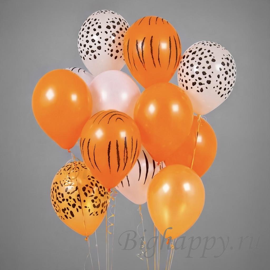 Тёплая оранжево-белая композиция из 12 латексных шаров, 5 из которых однотонные и еще 7 с анималистичным принтом африканских животных (тигровый и леопардовый).