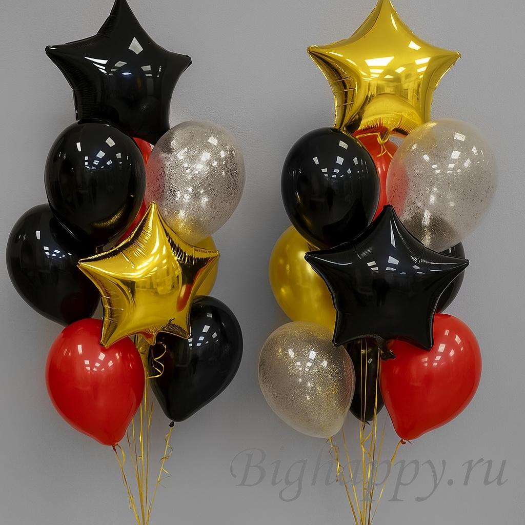 В эффектной цветовой гамме ― черный, золотой и красный. В каждой связке собраны фольгированные звезды, прозрачный шар с золотистым конфетти, золотой металлик и латексные шары.