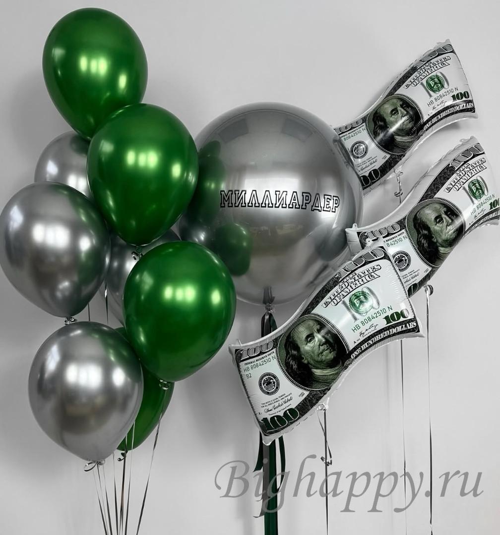 Создай атмосферу успеха и роскоши с эффектной композицией в серебристо-зелёных тонах! Стильные элементы с изображением долларов и акцентный шар с надписью «Миллиардер» станут ярким символом процветания и уверенности. Идеально для дня рождения, корпоратива или фотосессии в стиле luxury.