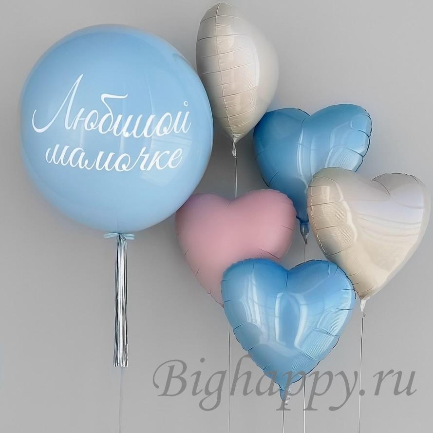 Нежная и утончённая композиция, созданная для самых тёплых чувств. Большой голубой дабл стафф с индивидуальной надписью наполняет пространство заботой и нежностью, а воздушный фонтан из пяти фольгированных сердец в оттенках голубого, розового и бежевого добавляет лёгкости и трогательности. Идеальный подарок, чтобы сказать о любви без слов!