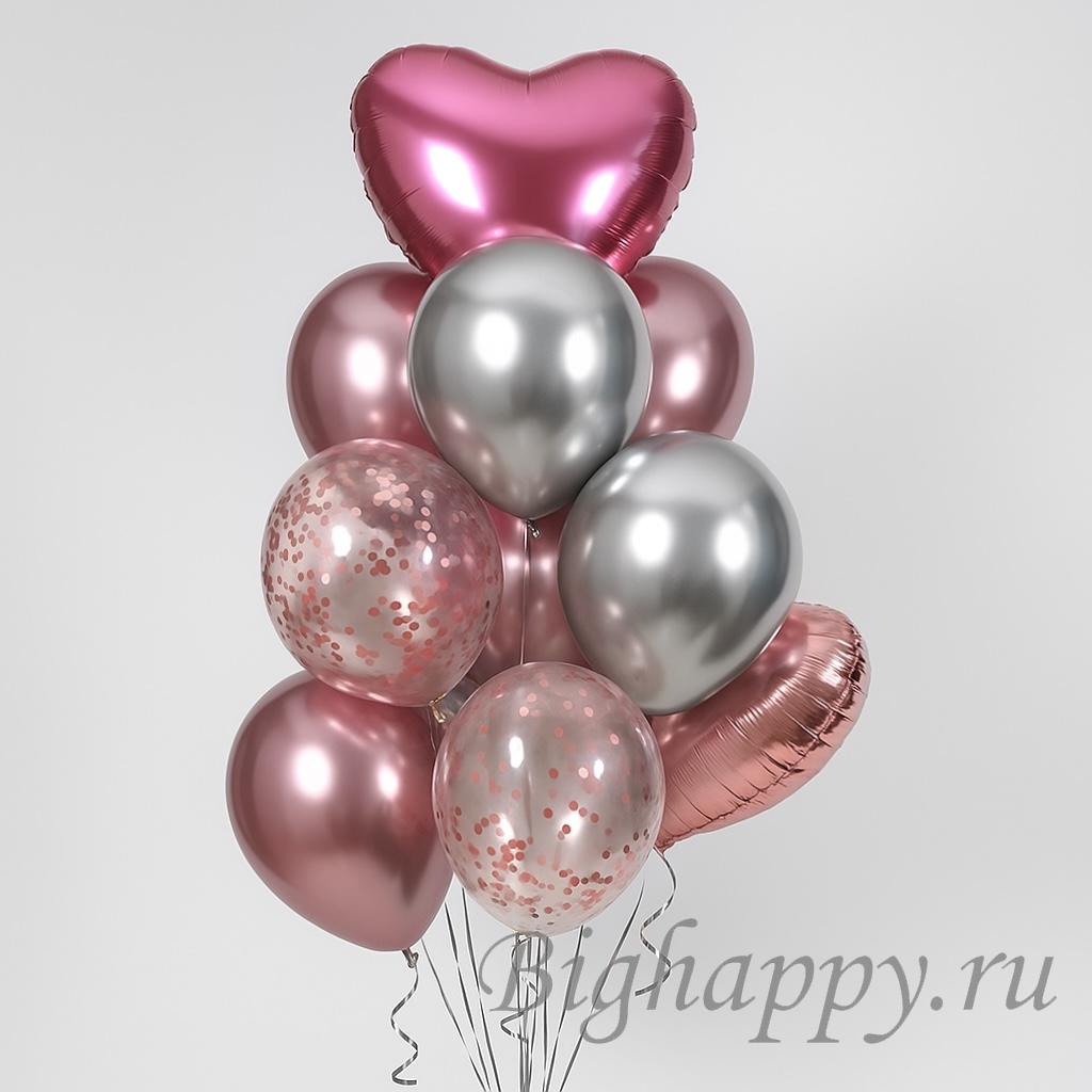 Красочный фонтан из розовых фольгированных сердец, шаров хром с перламутровым блеском и прозрачных с конфетти создадут легкое, приятное и беззаботное настроение своей обладательнице.
