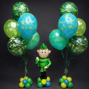 Дополняют композицию шар в виде камуфляжной звезды, золотая звезда с поздравительным текстом, насыщенно-зелёные латексные шары и прозрачный шар с конфетти. Все элементы гармонично сочетаются между собой, создавая мужественный и торжественный образ, который сразу приковывает взгляды.