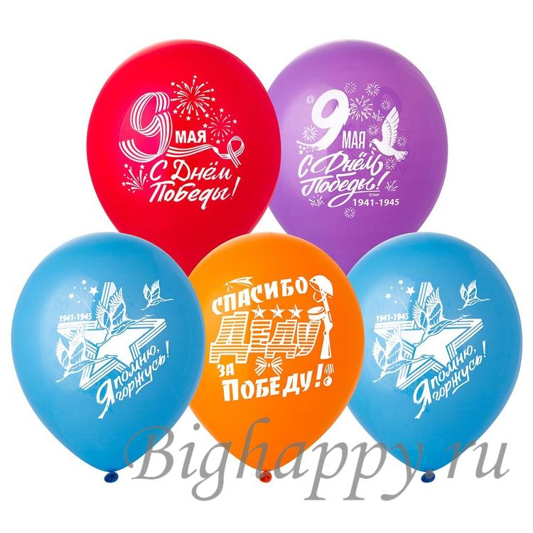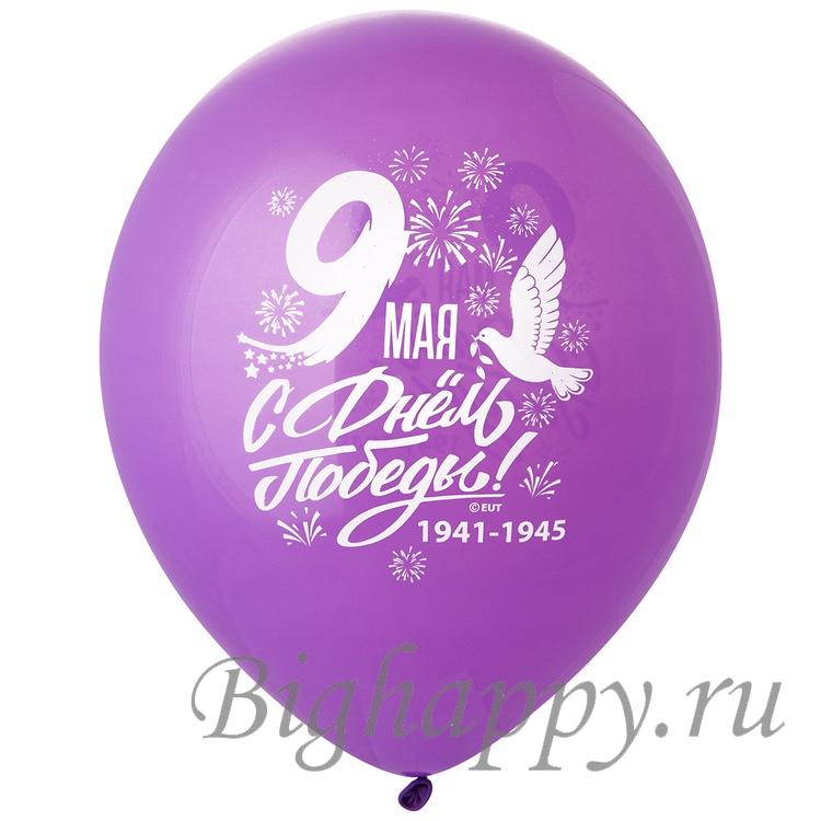 Латексные шары с печатью к 9 Мая — простой способ добавить в оформление узнаваемую символику праздника. В ассортименте несколько оттенков: красный, фиолетовый, голубой и оранжевый. Принты выполнены белой краской: «9 Мая», «С Днём Победы», «Спасибо деду за Победу», даты 1941–1945, силуэты голубей и элементы праздничного салюта.