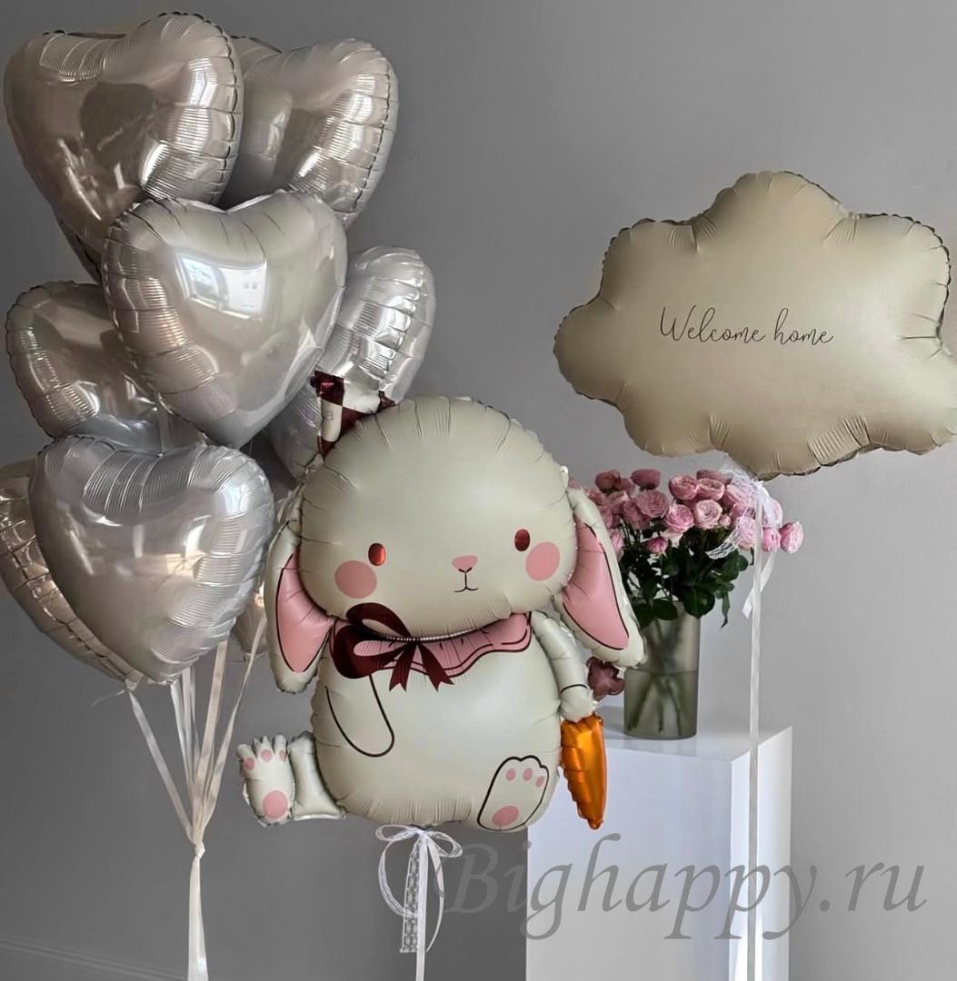 Трогательная композиция для самого важного момента — встречи малыша. Фольгированный зайчик и нежное облачко создают ощущение заботы и тепла, а фонтан из фольгированных сердец наполняет пространство любовью. Нежные бежевые оттенки выглядят стильно и уютно, красиво оформляя зону встречи из роддома, радуя родителей и становясь идеальным фоном для первых семейных фотографий.