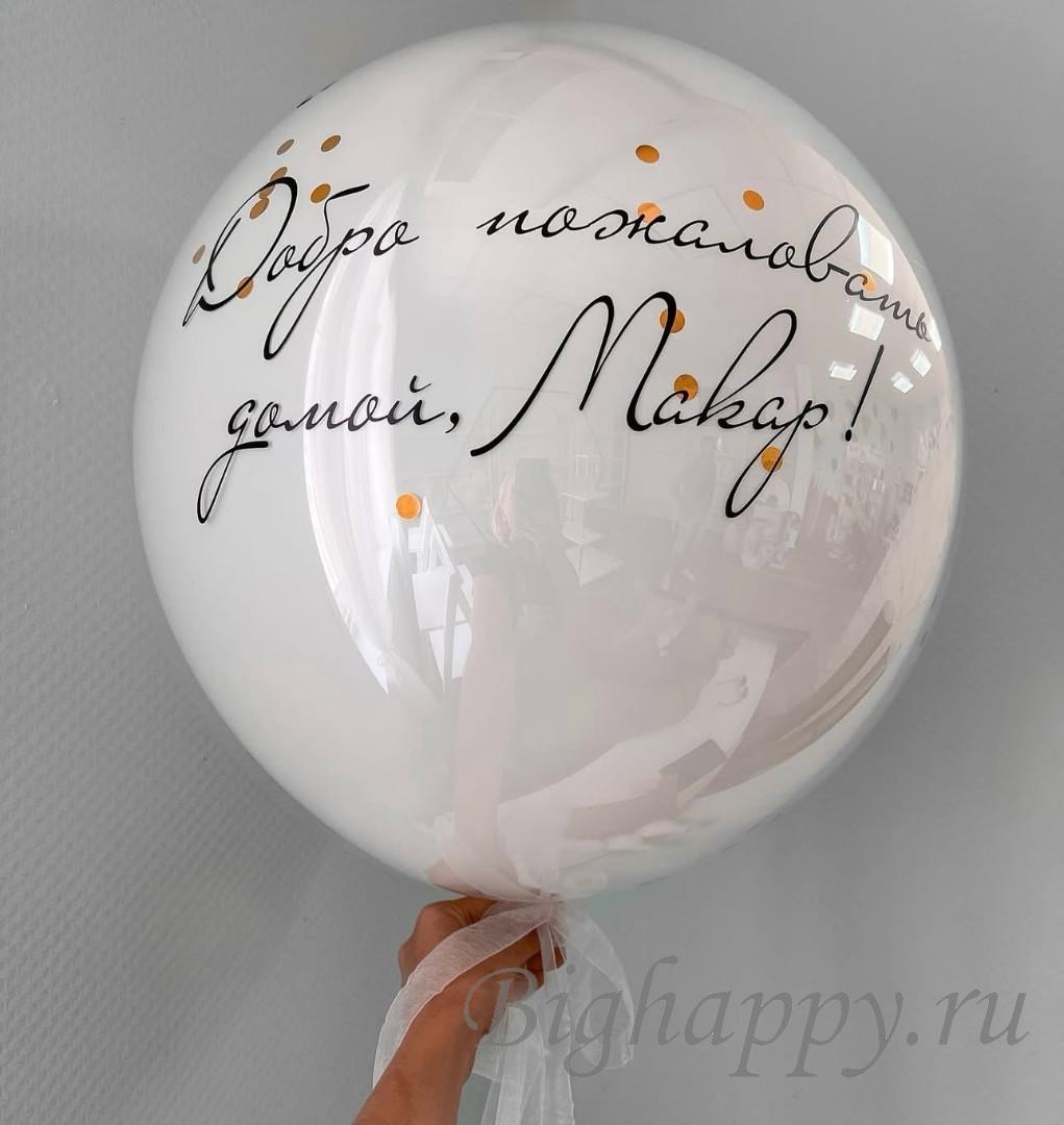 Стильный белый шар дабл стафф со «стеклянным» эффектом и сияющим конфетти станет выразительным акцентом праздника. Надпись может быть любой — от фразы до имени, даты или тёплого пожелания. Гладкая глянцевая поверхность красиво отражает свет и делает композицию по-настоящему особенной. Идеальное решение для встречи, выписки, дня рождения и трогательных сюрпризов.