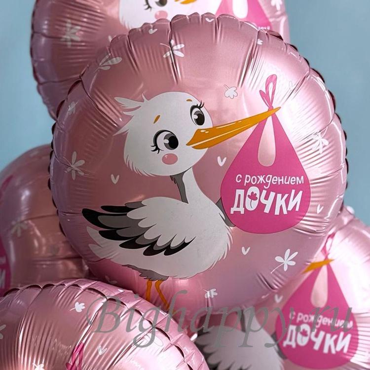 Фольгированный шар в розовом цвете с изображенным аиста, который держит в длинном клюве мешочек с надписью «С рождением дочки» - это отличный подарок на выписку из роддома! Представьте радость молодой мамы, когда по приходу домой она увидит прекрасно украшенную квартиру с помощью шариков, море эмоций гарантированы!