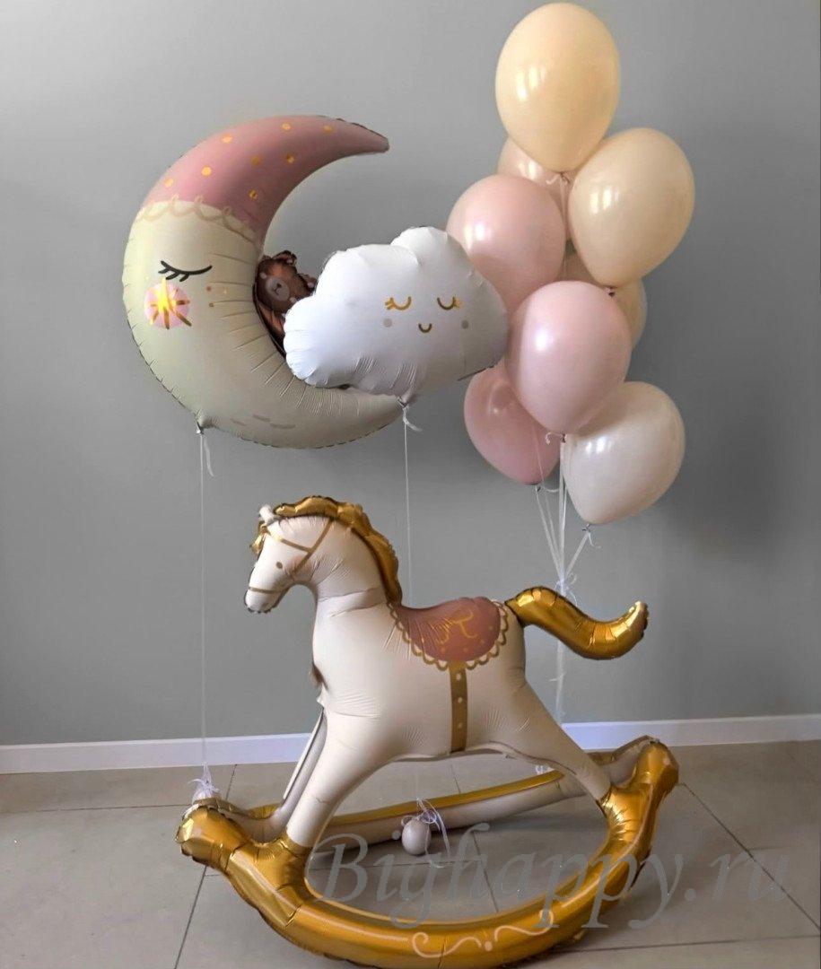Нежный набор создаёт атмосферу радости и уюта для встречи новорождённого. Фигурка Лошадка-Качалка, милый Медвежонок на луне и облачко в сочетании с пастельным фонтаном становятся эффектным и трогательным акцентом праздника. Идеально подходит для выписки из роддома, фотосессии или сюрприза для родителей, наполняя пространство теплом, счастьем и незабываемыми эмоциями.