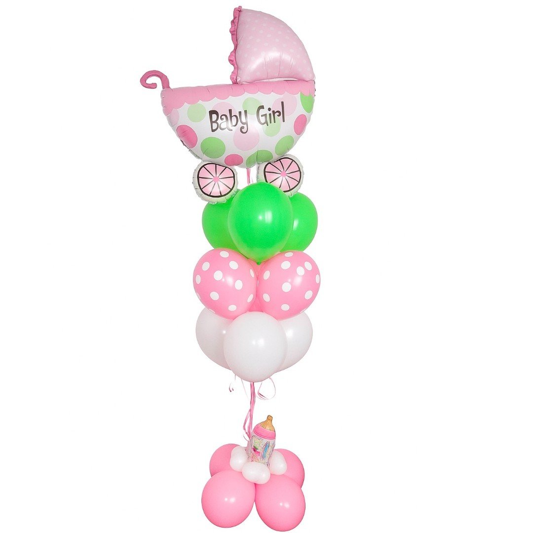 В композицию входит: 1 фольгированная коляска (73х95 см), 6 однотонных латексных шара (30 см), 3 латексных шара с рисунком (30 см), 1 фольгированная детская бутылочка (20 см), подставка из латексных шариков.