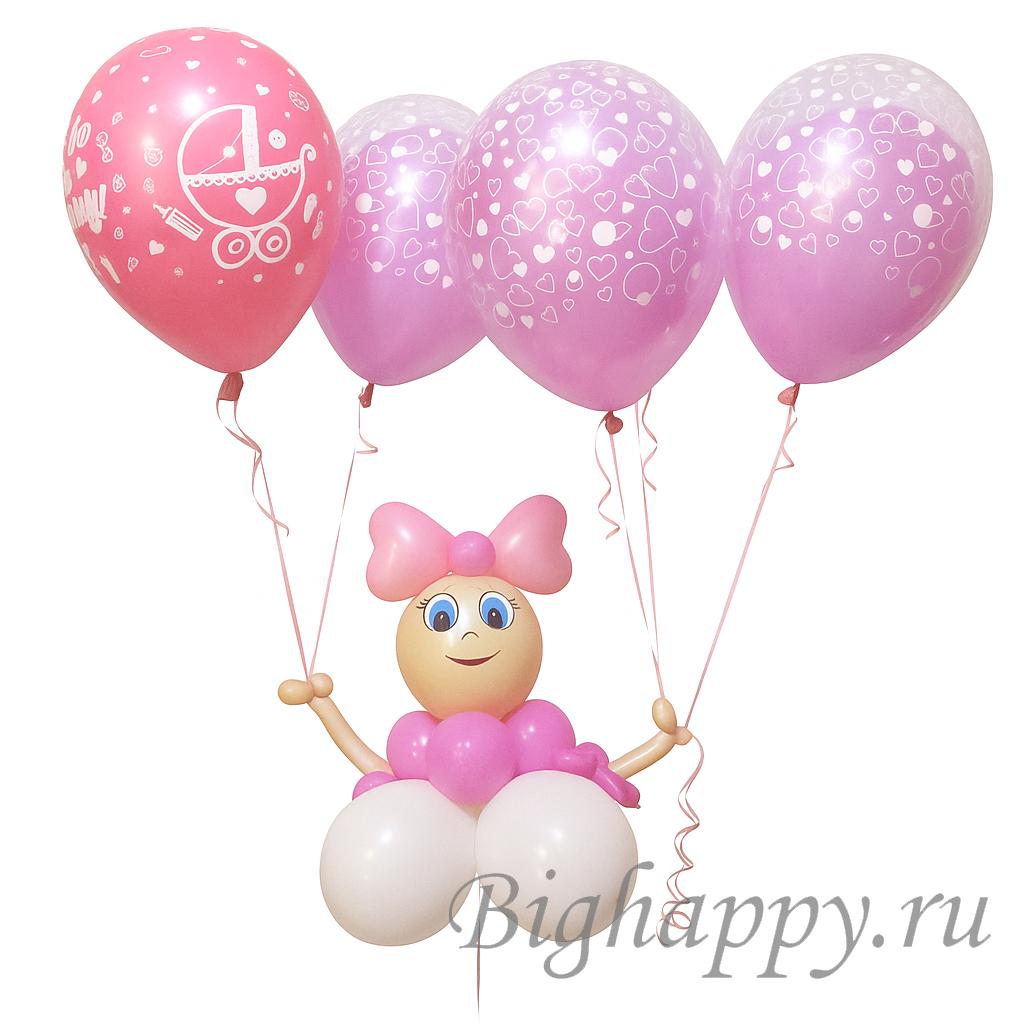 Трогательное и праздничное украшение для встречи мамы и новорождённой из роддома. Фигура выполнена из латексных шаров в виде маленькой девочки и дополнена связкой гелиевых шариков, что делает композицию особенно нежной и воздушной.