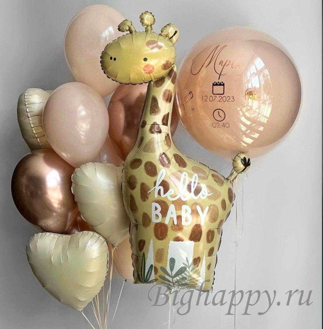 Этот гелиевый набор создан для трогательной выписки из роддома и первой встречи с малышом. Очаровательная фольгированная фигурка жирафика с надписью «hello baby», нежные сердца и шары в тёплой бежево-персиковой гамме создают атмосферу уюта и радости. Особый акцент — шар дабл стафф с индивидуальной надписью, который делает момент по-настоящему неповторимым. Такой декор наполняет пространство теплом и заботой, идеально подходит для фото и дарит ощущение счастья с первых минут.