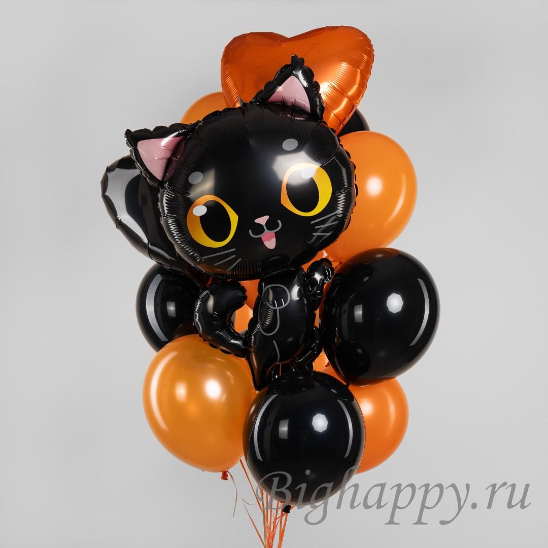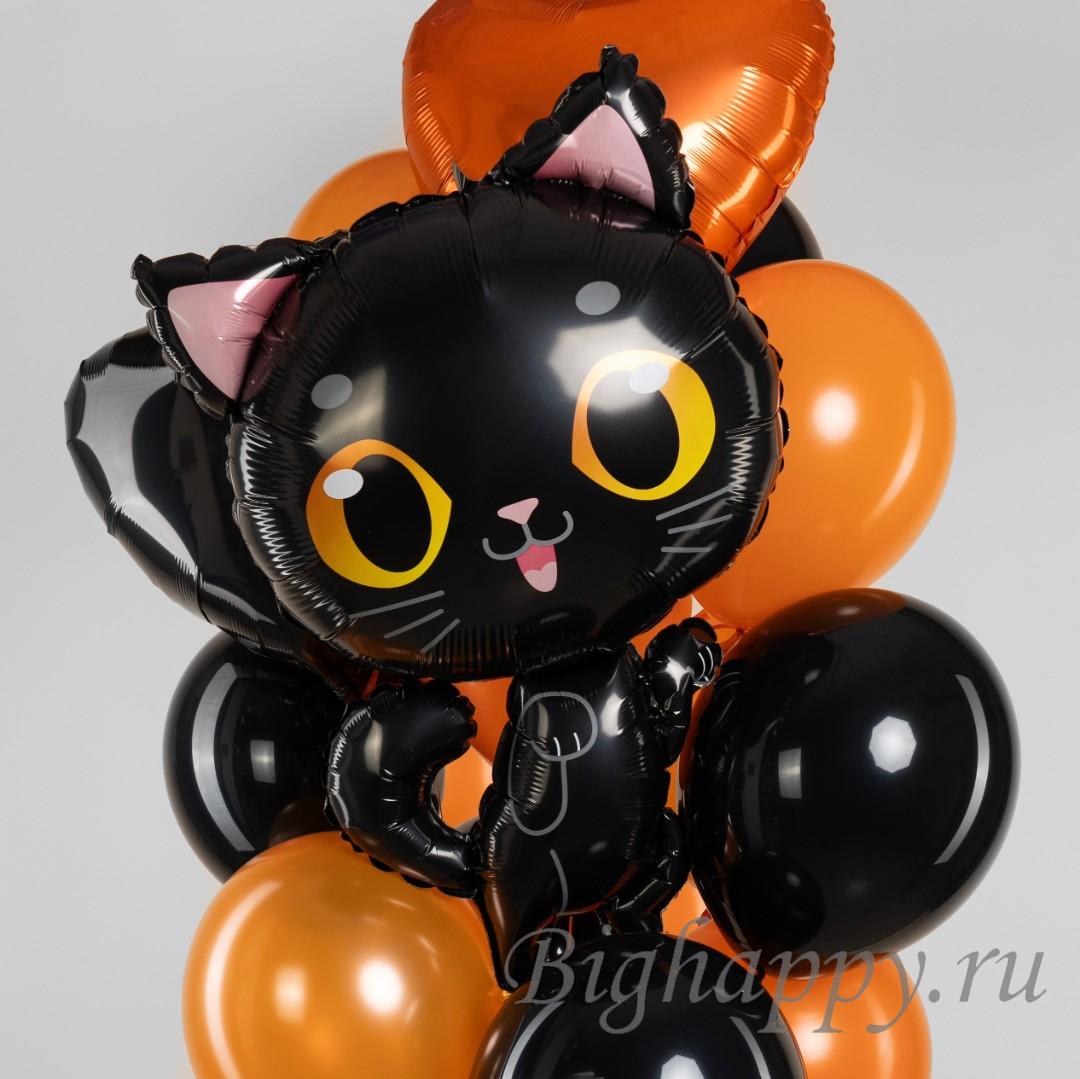 Черный котенок всегда был символом таинственности, магии и лёгкой интриги, а в сочетании с черными и оранжевыми шарами он превращается в очаровательный элемент праздничного декора.