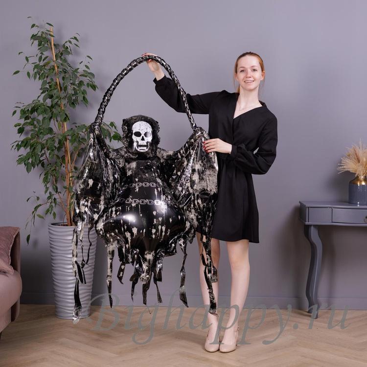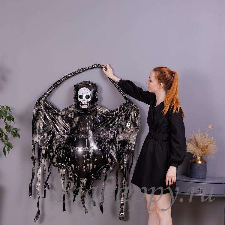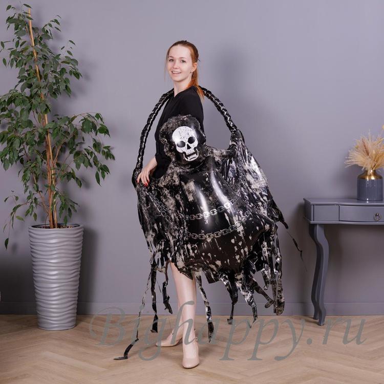 Зловещий силуэт скелета в черных лохмотьях, покрытый ржавыми цепями — этот фольгированный шар точно добавит драматизма в любое хэллоуинское оформление.