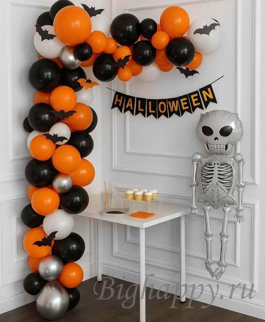 Погрузитесь в хэллоуинскую магию! Разнокалиберная гирлянда в чёрном, оранжевом, серебристом и белом цветах украшена маленькими летучими мышками, гирлянда-флажки с надписью «Halloween» и фольгированный скелет добавляют яркие акценты. Эта эффектная композиция превращает любое пространство в центр праздничного веселья, создаёт мистическое настроение и привлекает внимание гостей с первого взгляда!