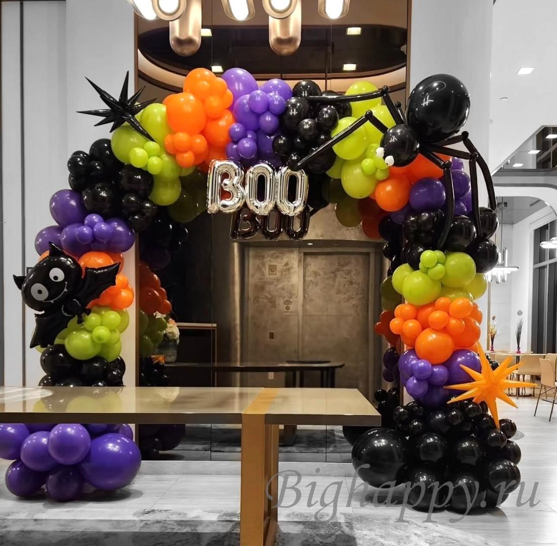Объемная конструкция собрана из множества шаров разных размеров, форм и фактур: от классических латексных в черно-оранжевой гамме до ярких фольгированных фигур. Такое сочетание создает ощущение динамики и «живого» декора, который завораживает с первого взгляда.