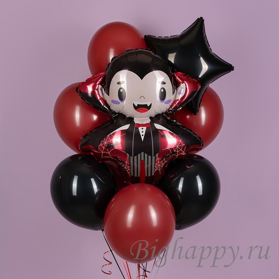 Его окружают 7 латексных шаров в черно-бордовых оттенках — цвета, символизирующие ночь и кровь, что идеально подчеркивает вампирскую тематику. Завершает композицию черная звезда, как символ темного неба и магии.