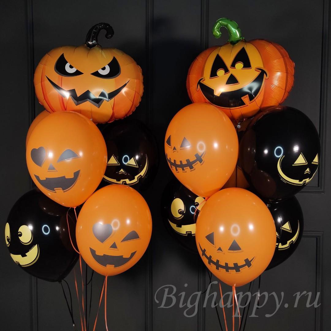 В каждом из 2 фонтанов ключевыю роль играет большая фольгированная тыква с устрашающей ухмылкой, дополненная яркими оранжевыми и черными шарами со злобным принтом.