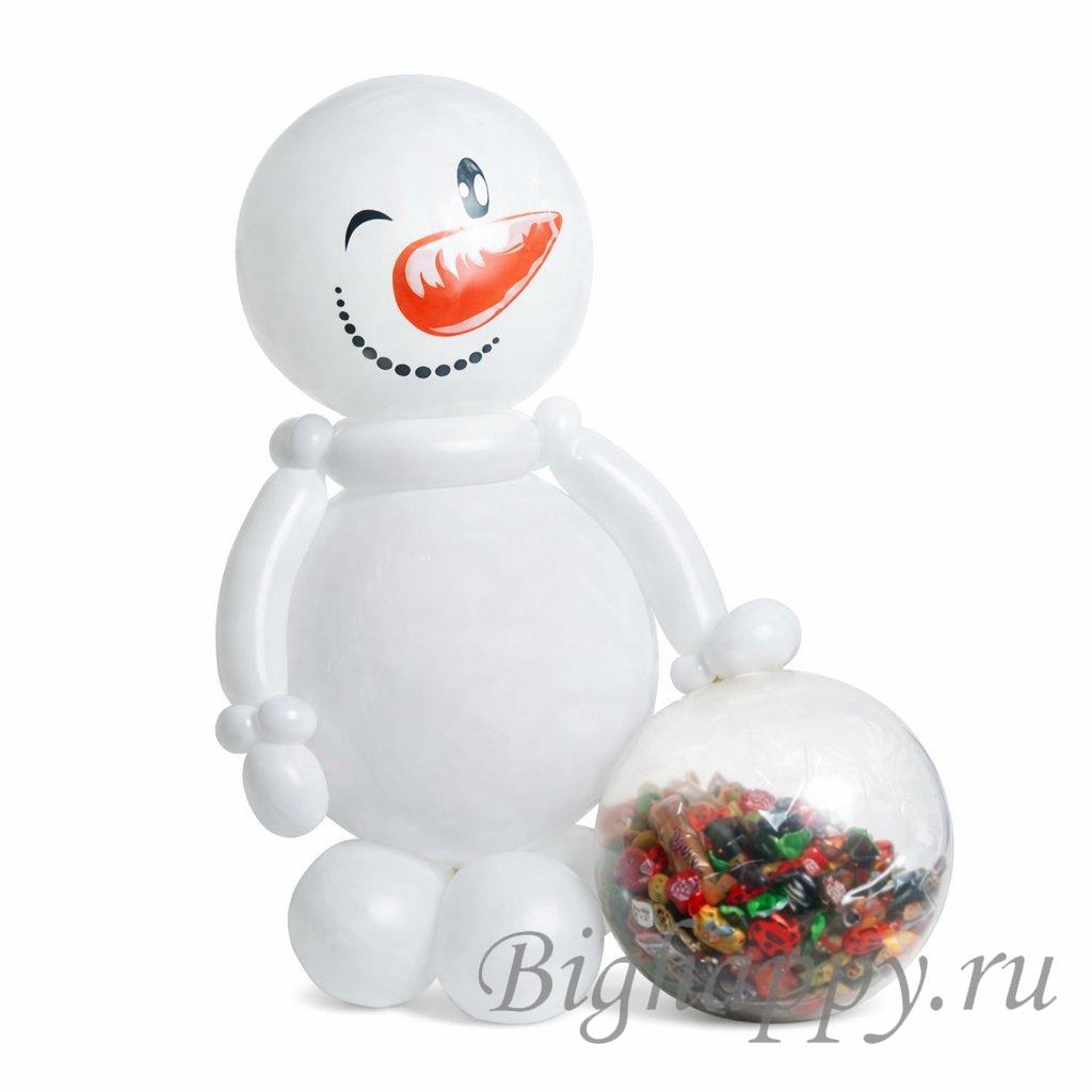 Прозрачный шар с конфетами можно с легкостью лопнуть, не травмируя фигуру Снеговика.