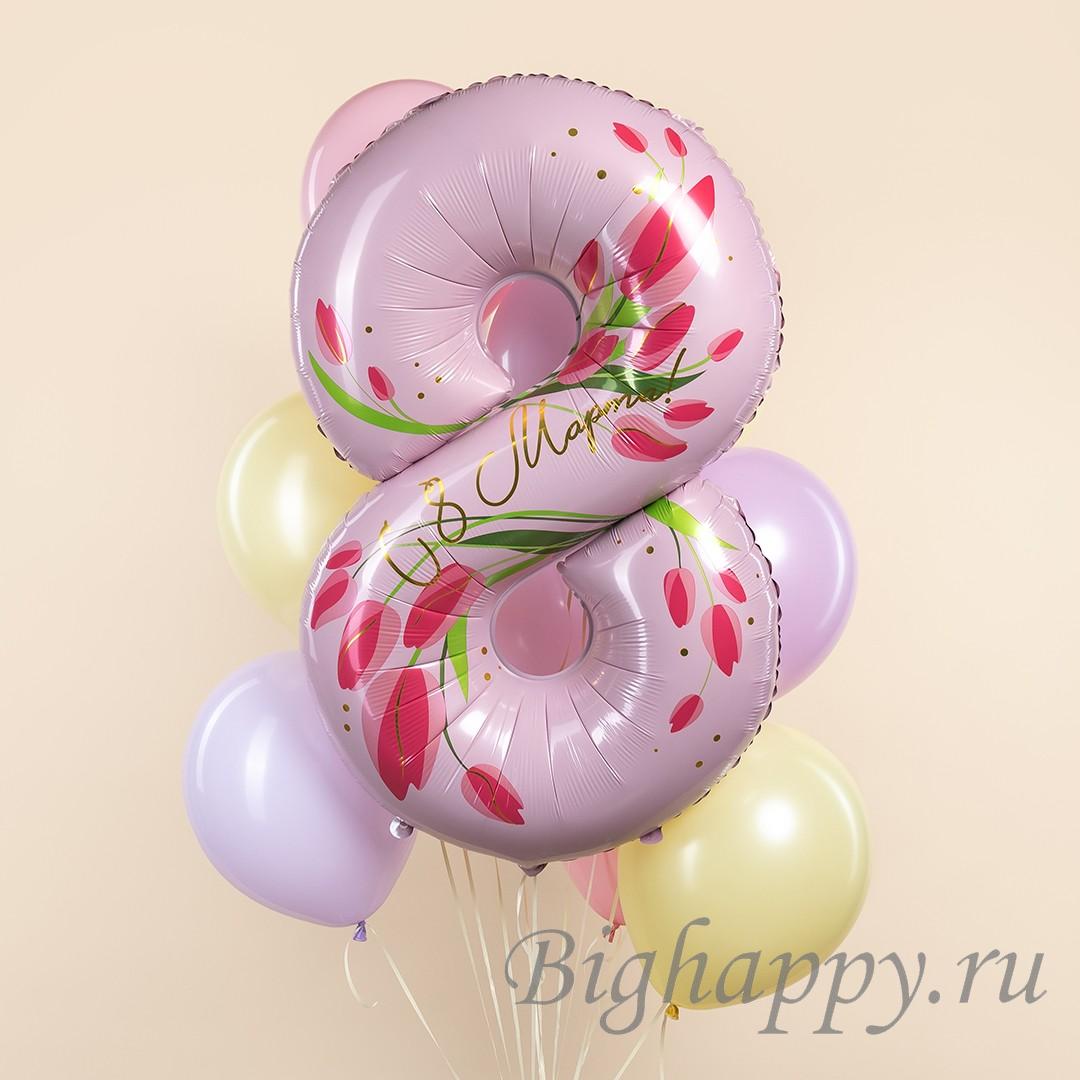 Тематическая композиция из воздушных шаров на 8 Марта с большой цифрой и связкой разноцветных шариков конфетных оттенков — нежное сочетание.