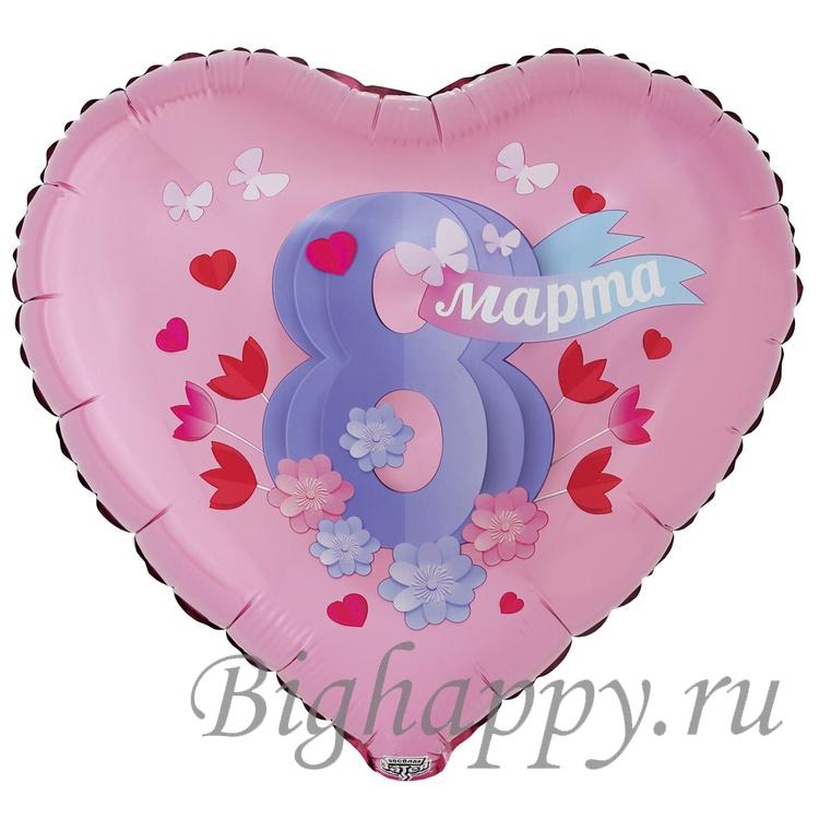 Нежный праздничный шар в форме сердца в мягких розовых тонах. Декор с объёмной цифрой «8», цветами, бабочками и яркими акцентами создаёт по-весеннему лёгкий и романтичный образ.