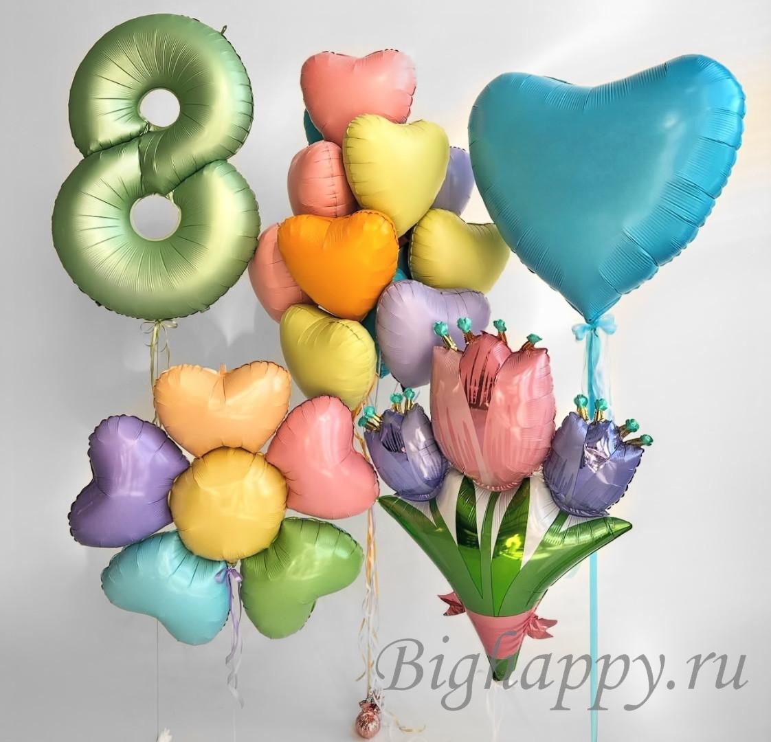 Яркая композиция с гелием создаёт атмосферу лёгкости и праздника. Нежные сердечки, фольгированная цифра 8 и стильный букет-тюльпанов формируют красочный акцент, который моментально привлекает внимание. Такой набор идеально подойдёт для дня рождения, детского торжества или на 8 Марта, наполняя пространство теплом, радостью и трогательными эмоциями.