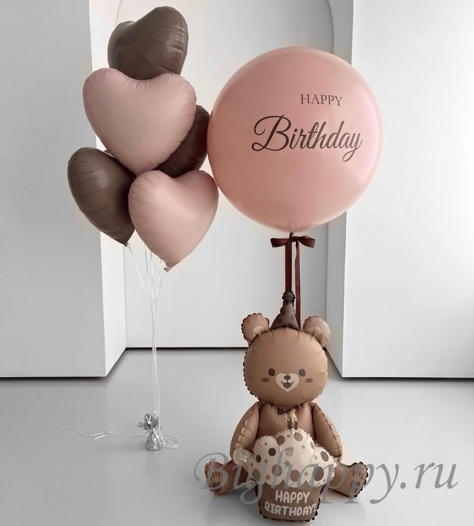 Нежный праздничный комплект с очаровательным медвежонком и воздушной композицией в тёплой шоколадно-пудровой гамме создаёт атмосферу заботы и радости. Надпись «Happy Birthday» добавляет акцент и делает поздравление универсальным для любого возраста. Идеально подойдёт для сюрприза, оформления фотозоны или уютного праздника дома. Эффектный и милый вариант, создающий радостное настроение с первого взгляда.