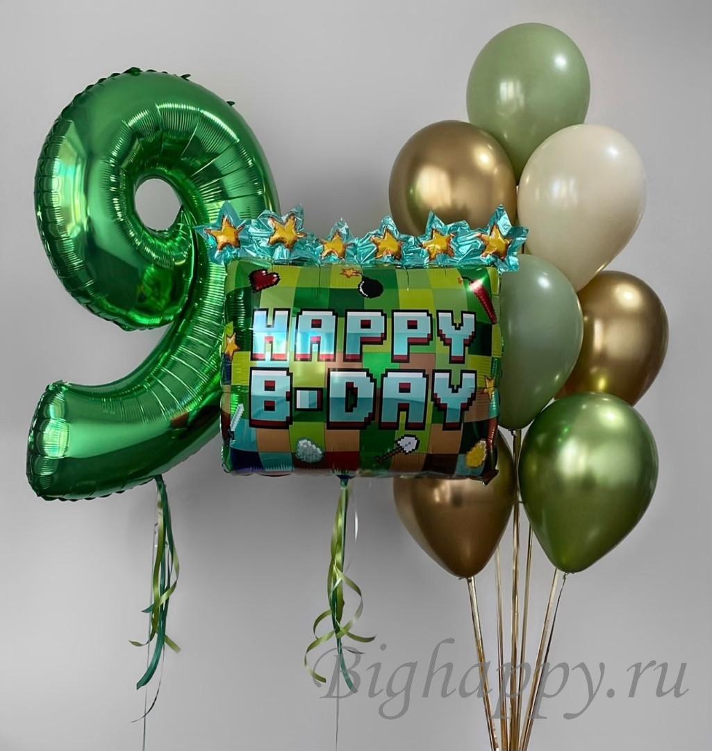 Эффектная композиция из воздушных шаров станет ярким акцентом на дне рождения вашего ребёнка. Большая цифра, праздничный шар с надписью «Happy B-Day» и изысканная гамма шаров в золотых, зелёных и кремовых оттенках создают атмосферу праздника, радости и веселья. Идеальный вариант для стильного оформления детского торжества!