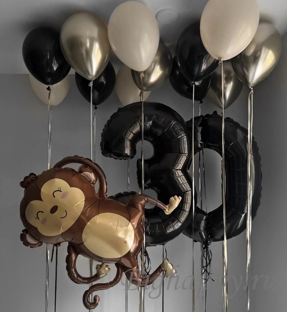 Создайте незабываемую атмосферу для яркого юбилея! Эффектные чёрные цифры сразу задают праздник, а весёлая обезьянка добавляет игривости и юмора. Шары под потолок в чёрных, золотых и бежевых оттенках заполняют пространство и поднимают настроение, превращая любое помещение в стильную фотозону. Идеальный набор для эффектного и оригинального праздника.