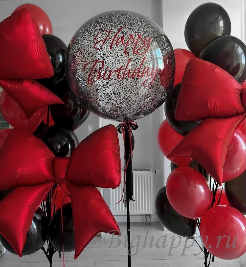 Яркий и эффектный набор в насыщенных красно-чёрных оттенках создаёт атмосферу страсти и праздника с первых секунд. Центральный прозрачный шар с конфетти и праздничной надписью становится главным акцентом композиции, а фольгированные банты и латексные шары добавляют выразительности и объёма. Идеально подойдёт для дня рождения или вечеринки, наполняя пространство энергией, эмоциями и стильным настроением.