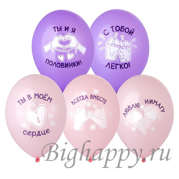 Розовые и фиолетовые шарики с надписями-признаниями: