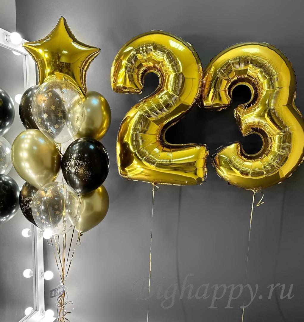 Праздник засияет волшебством! Две золотые цифры задают тон торжеству, а фонтан из золотых, прозрачных со звёздами и чёрных с надписью создаёт эффект праздника в каждом уголке. Яркая композиция превращает любое событие в незабываемое торжество и радует гостей с первой минуты!