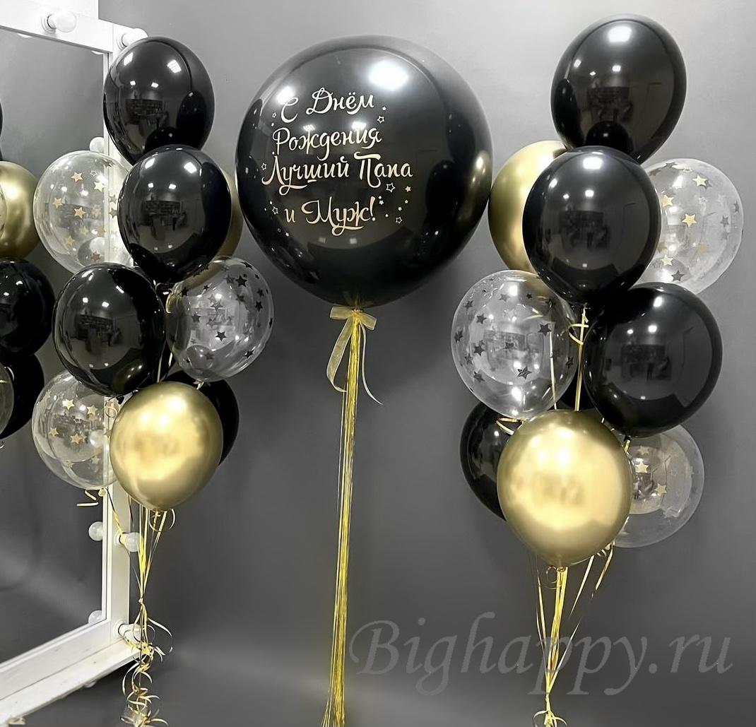 Эффектный набор, созданный для стильного мужского праздника. В центре композиции — большой чёрный дабл стафф с индивидуальной надписью, который подчеркнёт важность события. Дополняют его два фонтана из чёрных и золотых элементов с прозрачными акцентами и узором звёзд.