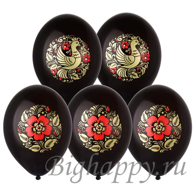 Выразительное сочетание чёрной основы и традиционного золотисто-красного орнамента. На одних шарах — декоративная птица в окружении завитков и ягод, на других — крупный цветок с характерной графикой. Контраст тёмного фона и тёплого узора создаёт эффект глубины, благодаря чему рисунок выглядит чётко и насыщенно.