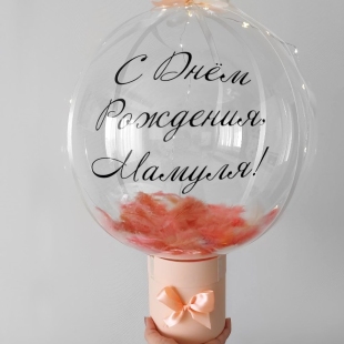 Набор выглядит элегантно и стильно. В центре внимания — большой шар дабл стафф нежно-розового цвета с надписью «Happy Birthday». Шар украшен аккуратными чёрными бантиками.