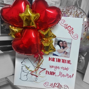 Дополняет композицию фольгированный шар в форме сердца розового оттенка, он сочетается с остальными элементами, поддерживая общую цветовую гамму. Завершающий штрих — фонтан из латексных шаров пастельных розовых и молочных оттенков. Каждый шар также украшен маленькими чёрными бантами, создающими единство композиции и подчёркивающими её элегантный характер.