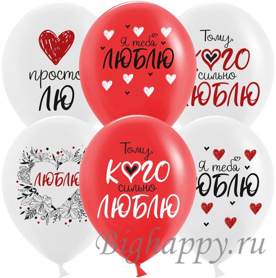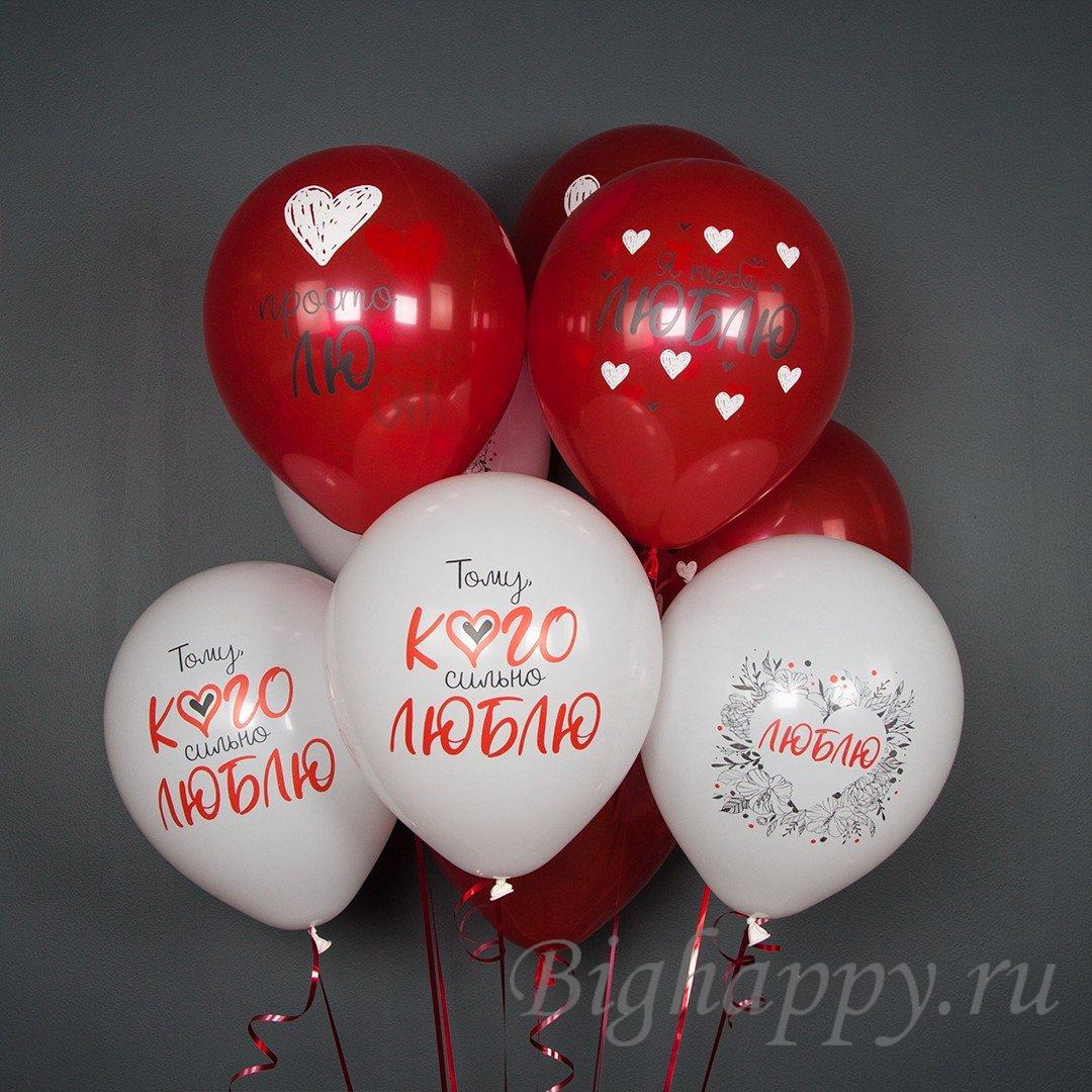 Белые и красные воздушные шары из латекса, на каждом присутствует рисунок.